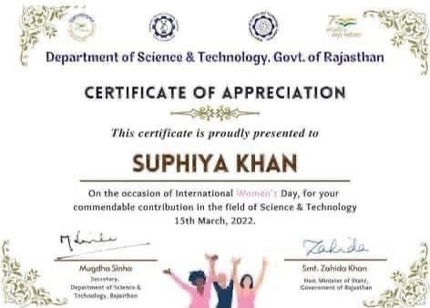 Felicitated on women’s day by the Department of Science and Technology, Govt. of Rajasthan for commendable work in science and technology.